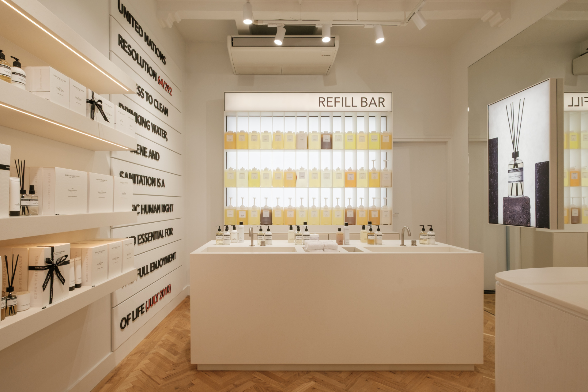 Bezoekers kunnen er terecht voor de volledige collectie luxe body- en homeproducten, met een sterke focus op refill. In de boutique is een Refill Bar aanwezig, waar bijna het hele assortiment eindeloos nagevuld kan worden tegen een gereduceerde prijs. Zo bespaar je niet alleen kosten, maar ook afval, CO₂ en water – en draag je actief bij aan een lagere impact op het milieu.